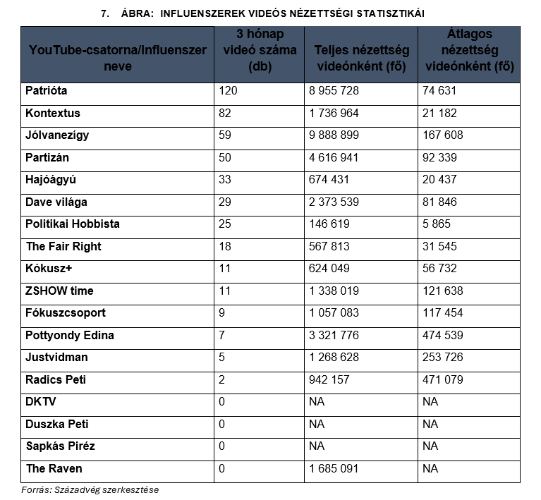 Az adatok alapján a kormánykritikusnak tartott csatornák – a Patrióta (224 ezer fő) kivételével – jellemzően magasabb követőszámmal rendelkeznek. A legnagyobb elérést a leginkább politikai fennhanggal szatirikus videókat készítő Radics Peti (962 ezer fővel) érte el, őt Justvidman (797 ezer fővel) és a Partizán (556 ezer fővel) követi. A nem kormánykritikus csatornák közül a Patrióta mellett a Kontextus (75,2 ezer fő) és a The Fair Right (61,8 ezer fő) rendelkezik számottevő feliratkozóval. A lista végén mindkét kategória képviselői megtalálhatók: a Hajóágyú (19,6 ezer fő) és a kormánykritikus Sapkás Piréz (3,01 ezer fő).